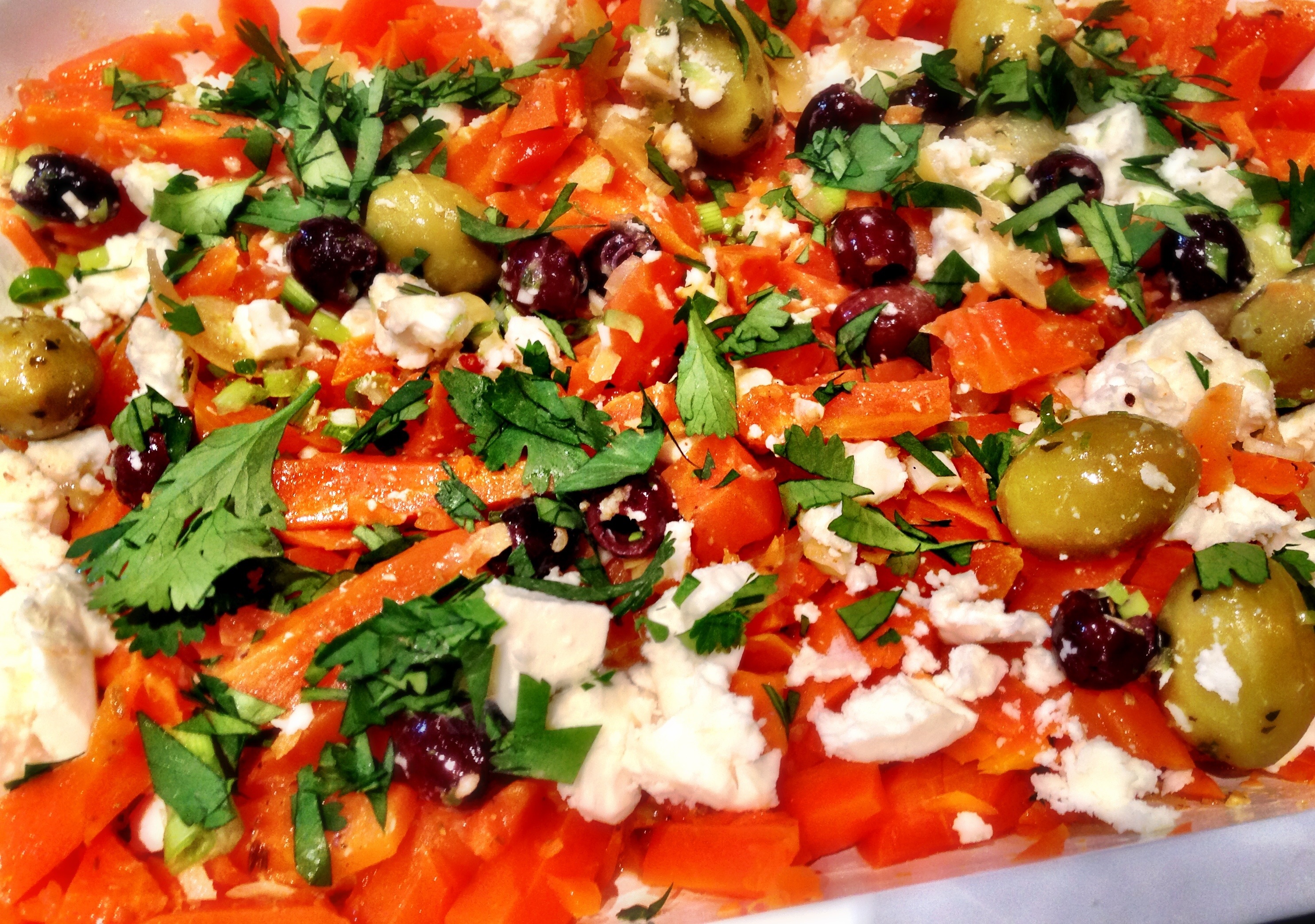 Mash the carrots a bit (I didn’t as I didn’t have a masher! – I just blitzed them for 5 seconds in a Magimix) and dress the carrots in the dressing and top with mixed olives, feta and coriander (cilantro in the book) and optionally some spring onion (scallions) and preserved lemons.