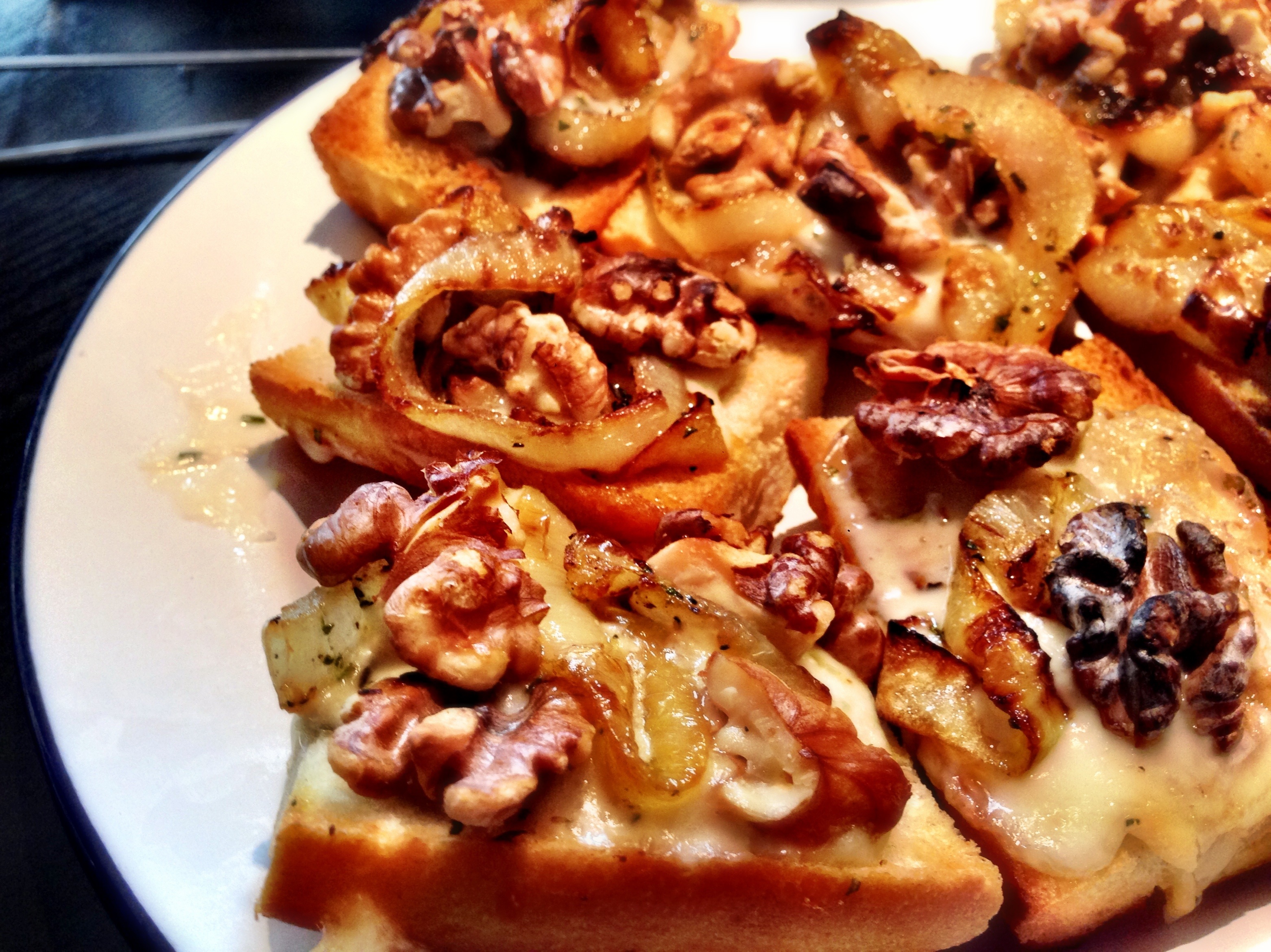 Toast some bread on both sides – then add the gorgonzola, walnut halves and onion – and grill again until the cheese melts.