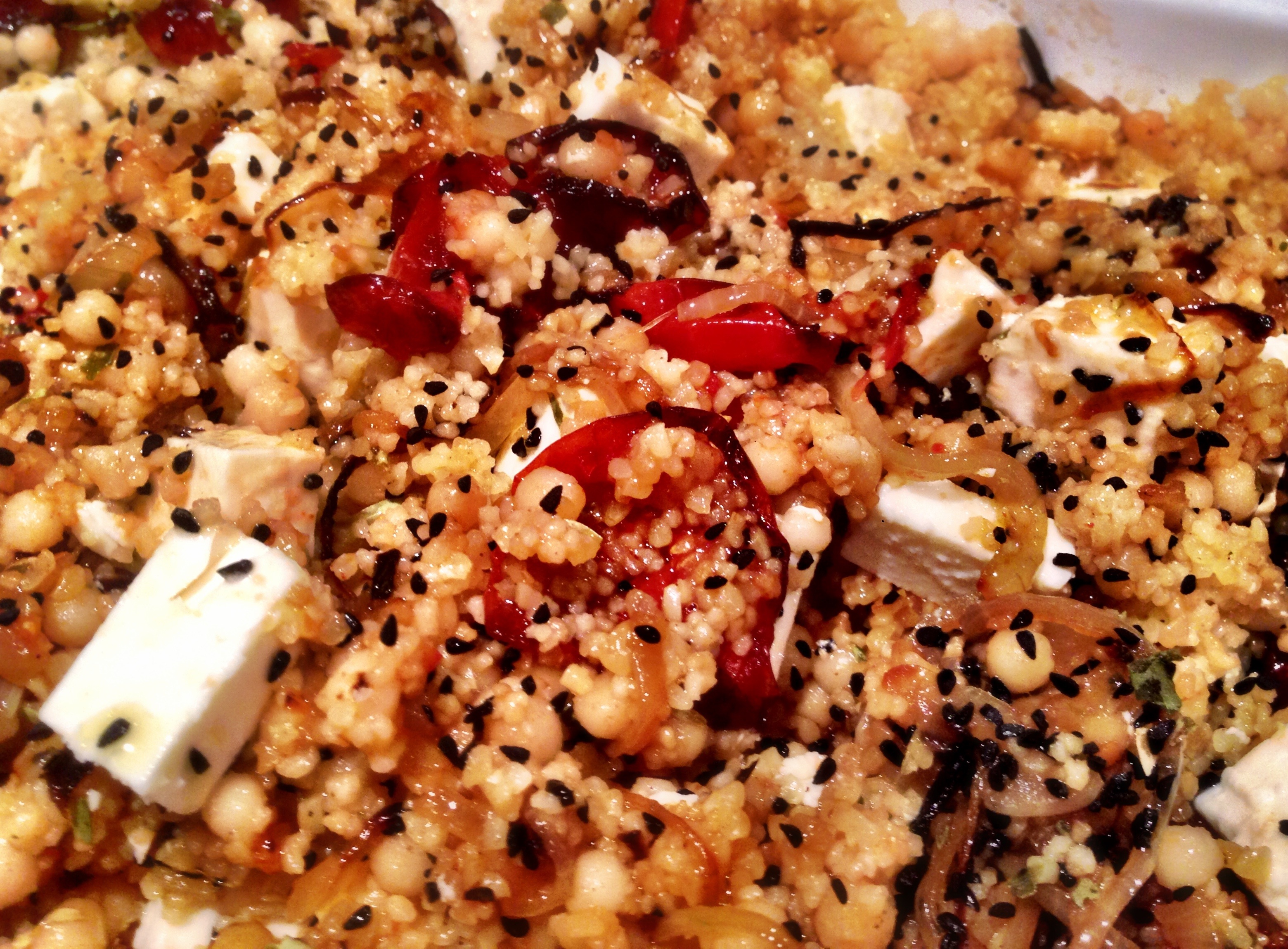 Once the tomatoes are ready, mix the couscous, moghrabieh, onions and tomatoes in a serving dish – including all the tomato juice and some Nigella seeds and mix a little. Add some Nigella seeds and more Olive oil as a topping and you are done. Dress with cheese if you want !