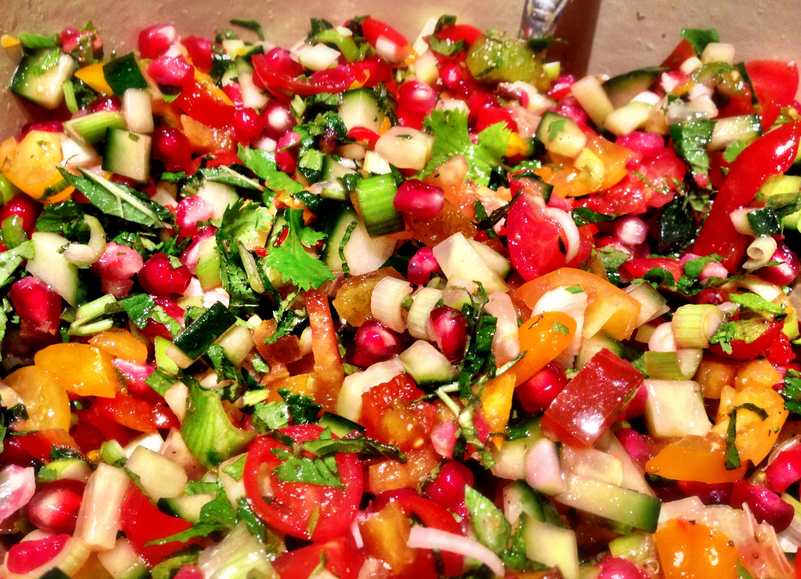 The keen eyes amongst you will realise as I did that this dish could have been called anything – there are a lot of ingredients in this dish other than the two in the title. Pretty much every ingredient in this dish is in equal proportion. Pomegranate, cucumber, tomato, peppers, spring onions, mint, coriander – lots of very fresh ingredients. There is also a hot chilli pepper to give it some kick. I added a Scotch Bonnet. There’s even more zinginess from the juice of some limes.