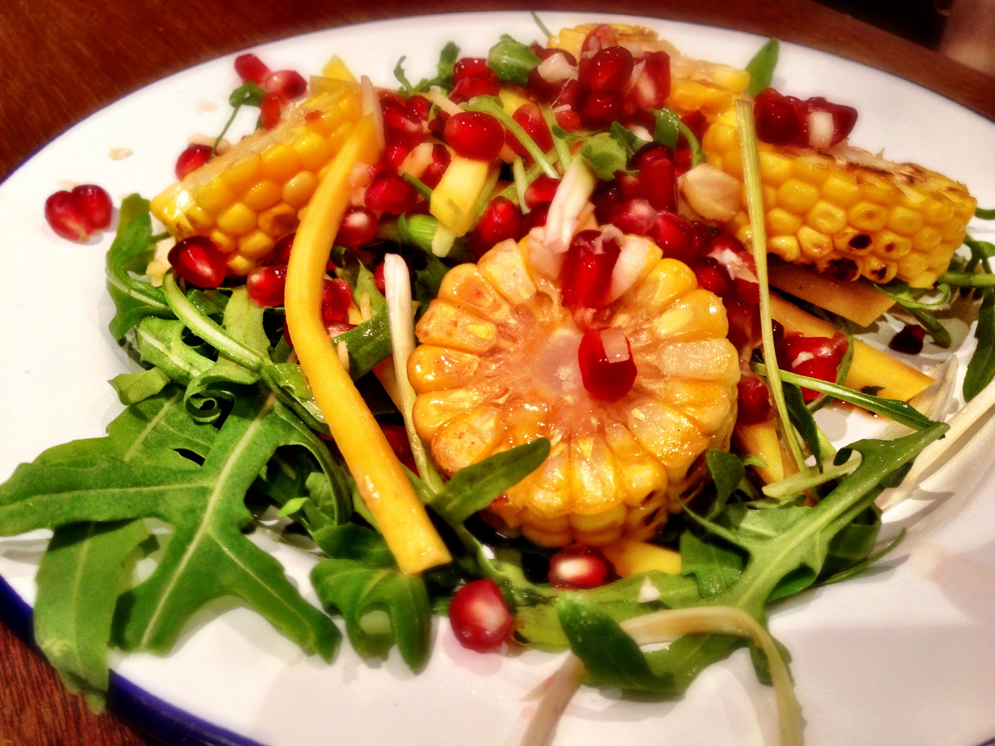 You simply boil some corn on the cob, then slice it into 2cm slices and sear it in oil on a hot plate. While you’re waiting you mix together some rocket, pomegranate seeds, mango, spring onions, bamboo shoots (which I omitted because mine weren’t fresh enough) and toss in a dressing of sunflower oil, lime juice, garlic, ginger and pomegranate molasses.