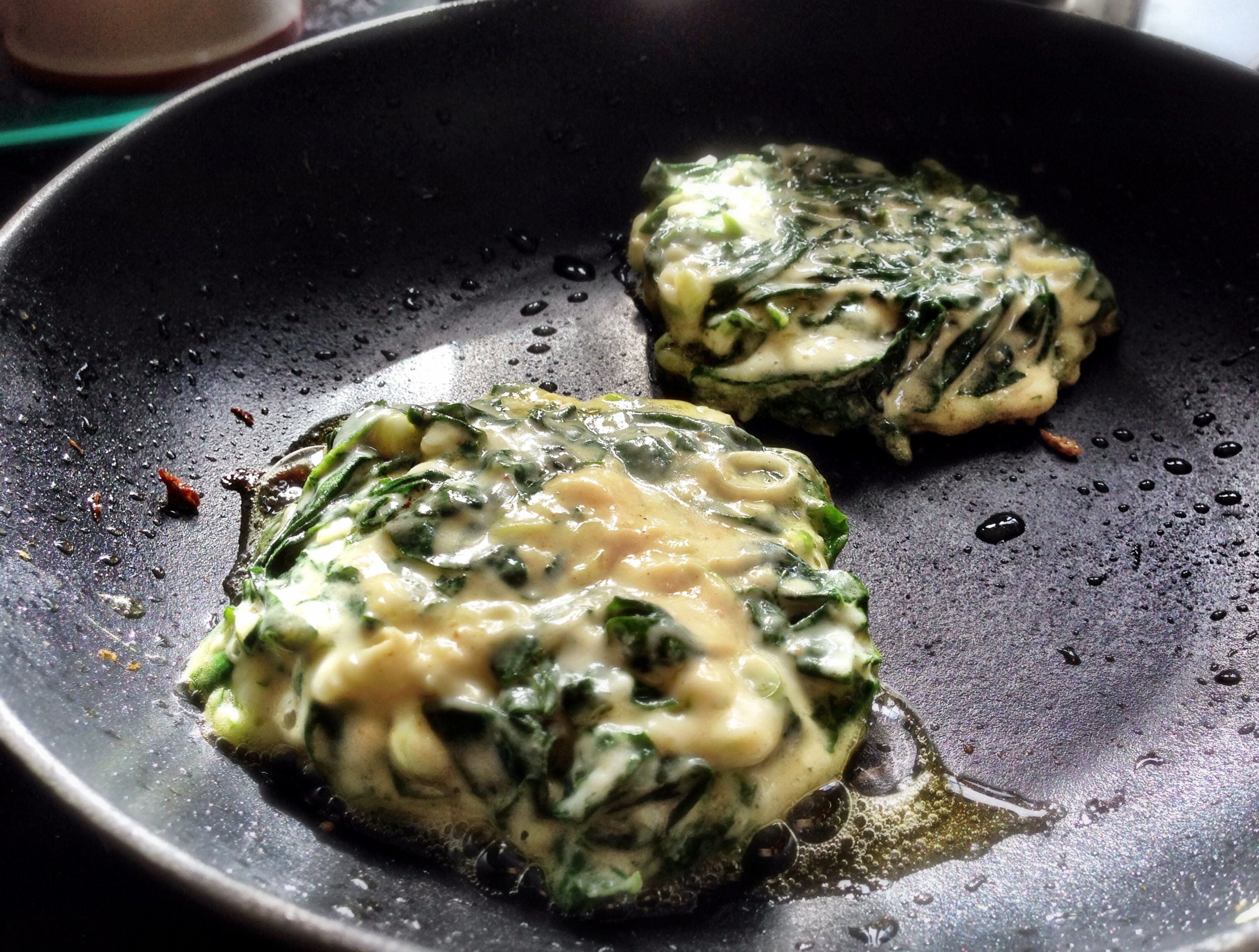 Essentially its just a pancake batter with spices – and then some cooked, squeezed and shredded spinach is added before frying them in olive oil. You’re supposed to use self raising flour but I didn’t have any – so I added 2 tablespoons of baking powder. You also fold in a ‘beaten to soft peaks egg white’ which made the pancakes quite fluffy.