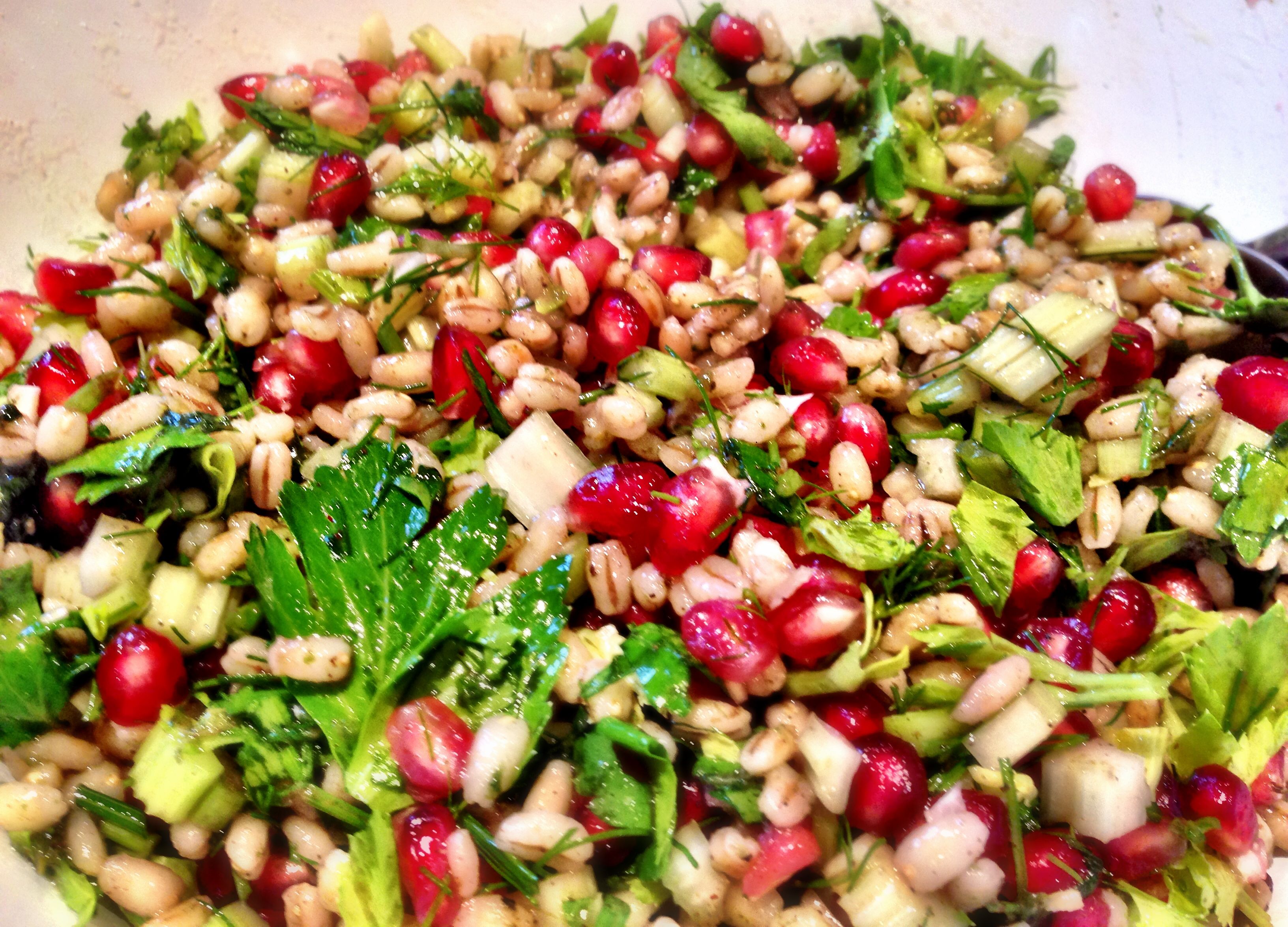 Simply prepare some pearl barley (boil it until it is tender and has a little bite to it) and then drain and cool under the tap. When it is done throw in some pomegranate seeds, diced celery, coriander, dill and a dressing. Couldn’t be easier than that. If you buy untrimmed celery, keep the celery tops (the leaves) and add them at the end too.