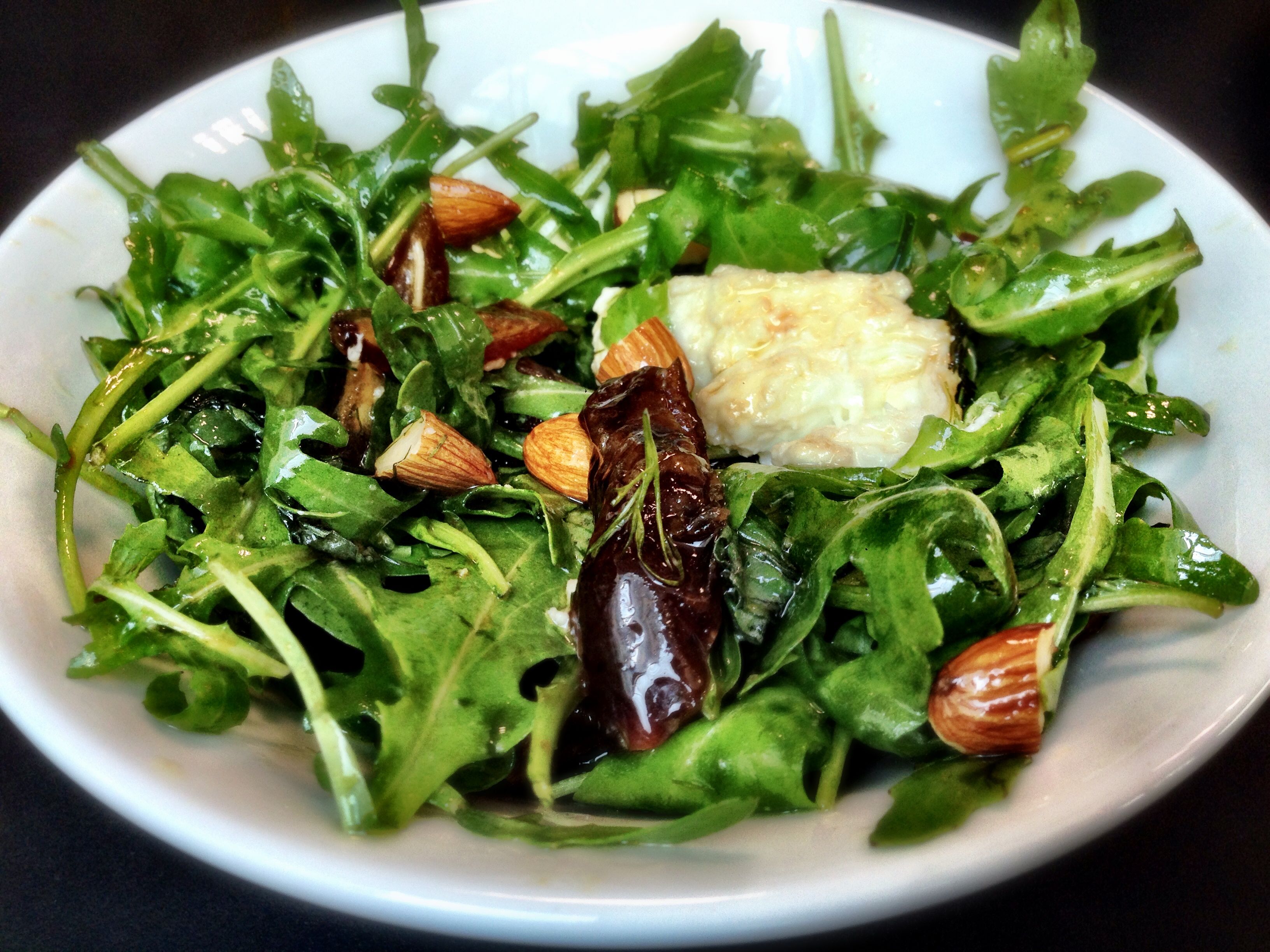 This one is rocket, mozzarella, almonds and Medjool dates. The dressing is olive oil and pomegranate molasses. There’s some basil and dill in there too.