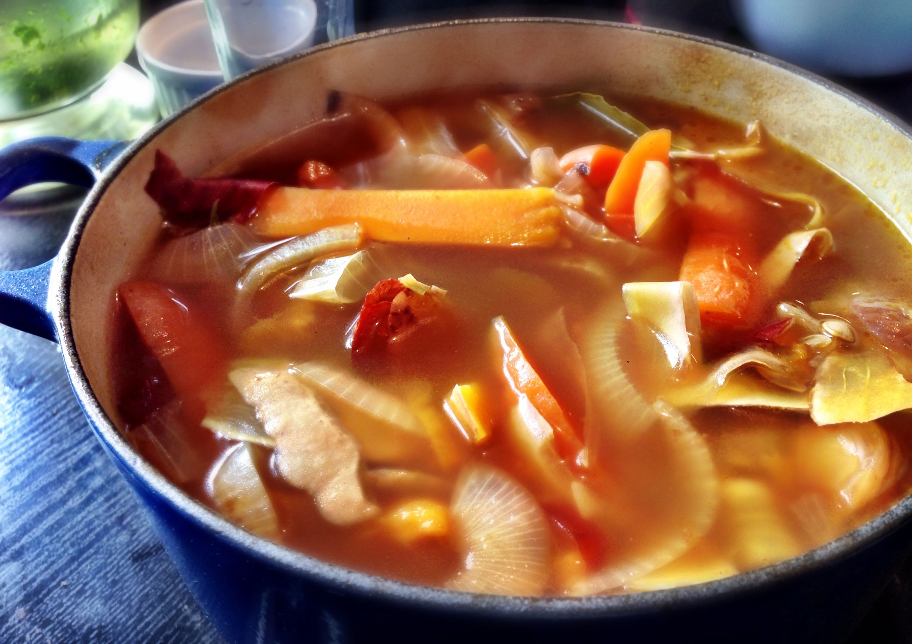 To make this you peel a butternut squash, and put the peelings with some onions (peel and all), garlic, carrot and water in a big pan and boil it up to a stock.