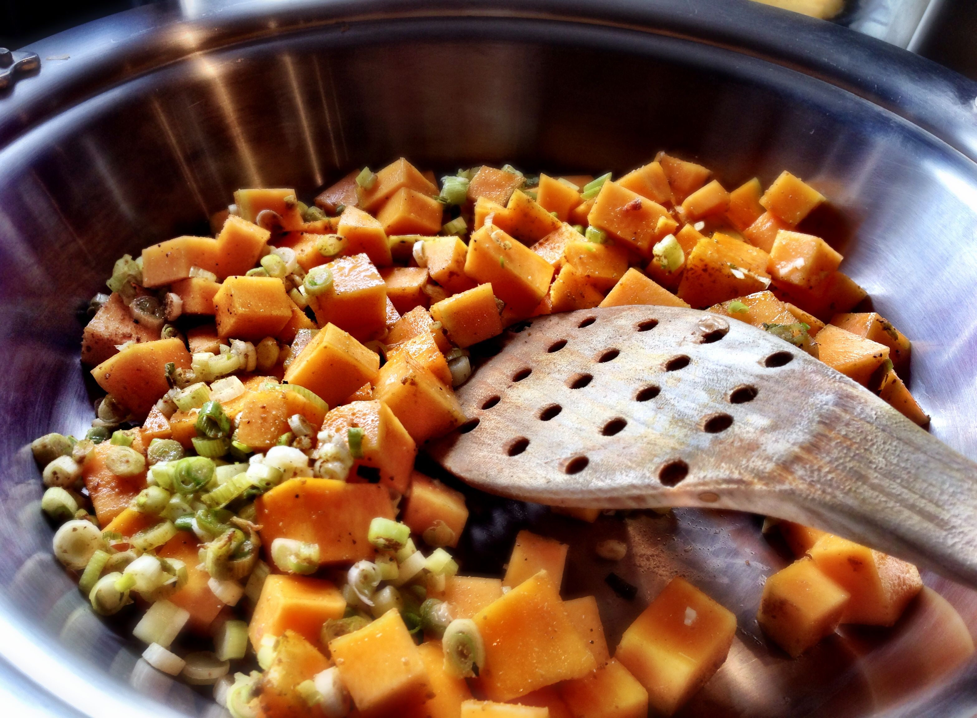 Next, fry off the other end of the squash in a pan. I messed this up last time I made it by not reading the recipe properly – I ended up roasting the whole squash. To be honest I don’t think it makes the blindest bit of difference. You fry the squash with shallots (I used some left over spring onions) and some spices.