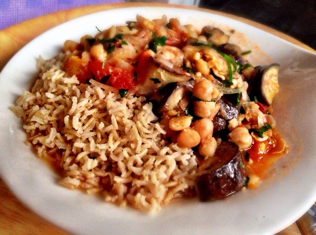 Another impromptu dish then is this Chickpea and Sweet Potato stew which I’ve grabbed from the ladies at Honestly Healthy. This is from their first book and I chose it because I already had all the ingredients in the cupboard (apart from the aubergine which I popped out and bought).