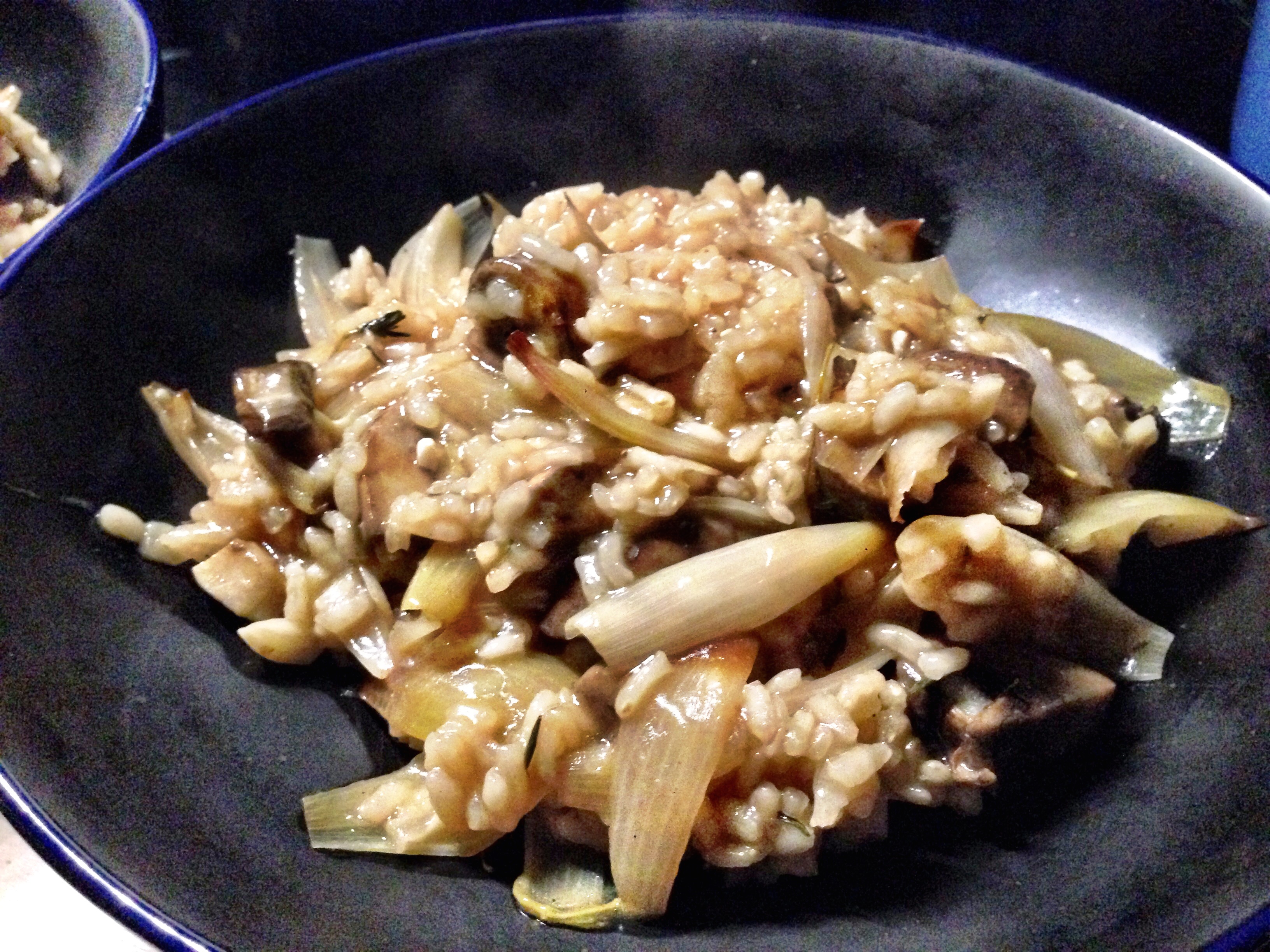 Simply quarter and roast some shallots with some thyme in an ovenproof casserole until they are soft – almost caramelising. Add chestnut mushrooms, garlic and balsamic vinegar and roast some more. Finally add stock and risotto rice and roast until the stock has absorbed into the rice. It took about an hour for me.