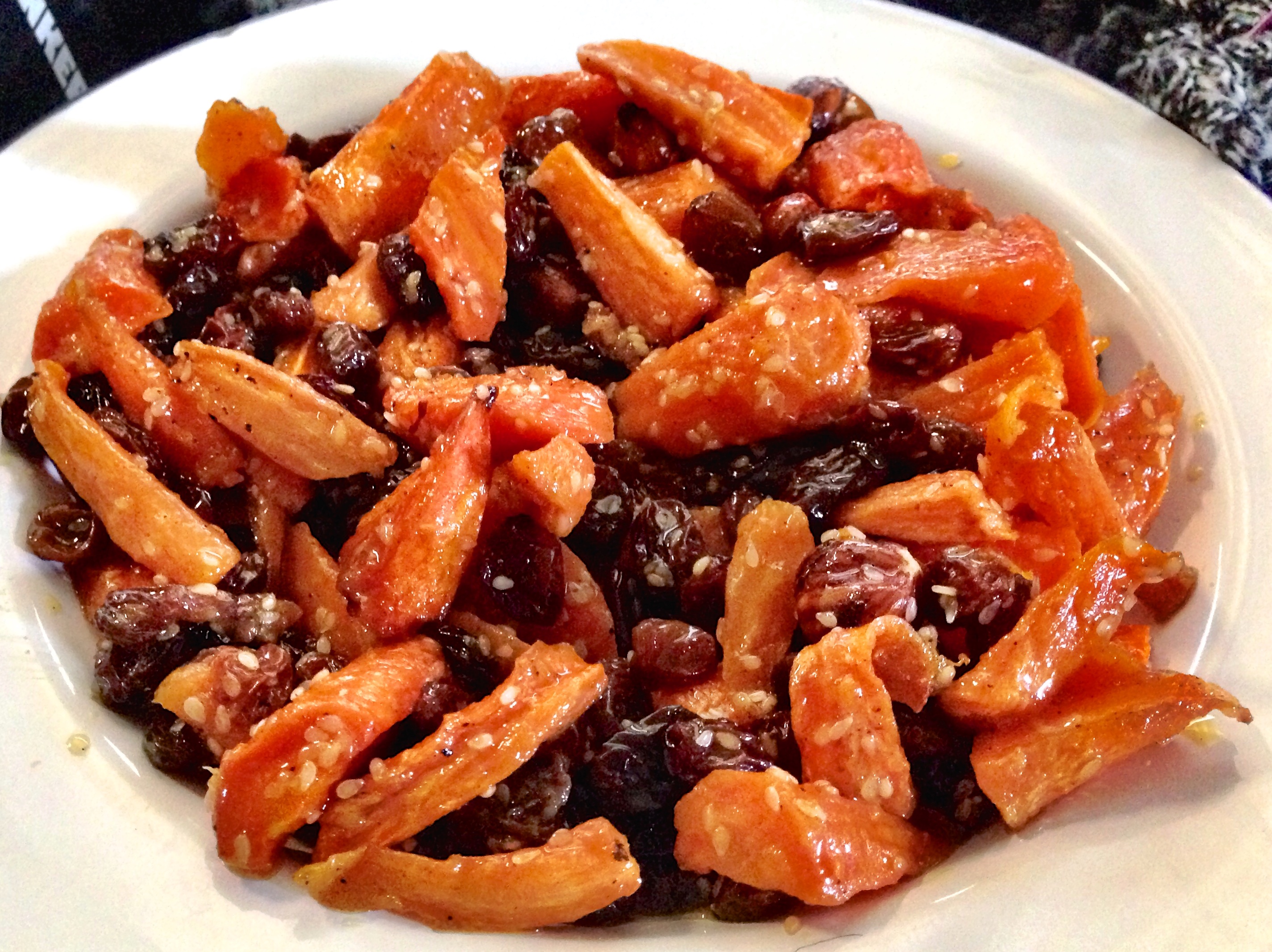 But what’s that you see in the picture – raisins? While the carrots are roasting simmer some runny honey and some orange zest and juice and add some raisins. Turn off the heat and let them soak up the juice.