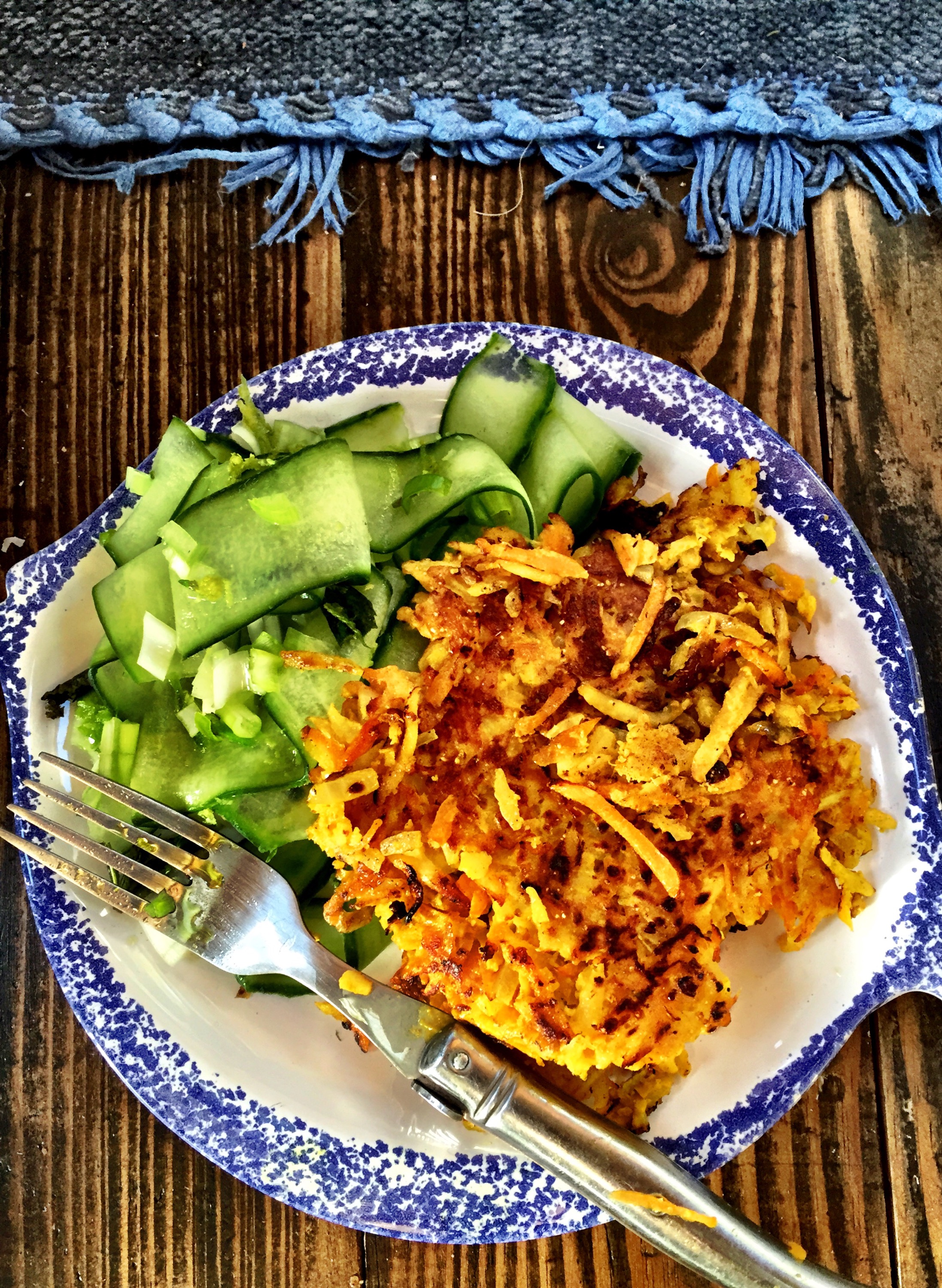 Carrot, Parsnip and Apple Latkes with a Cucumber Ribbon Salad