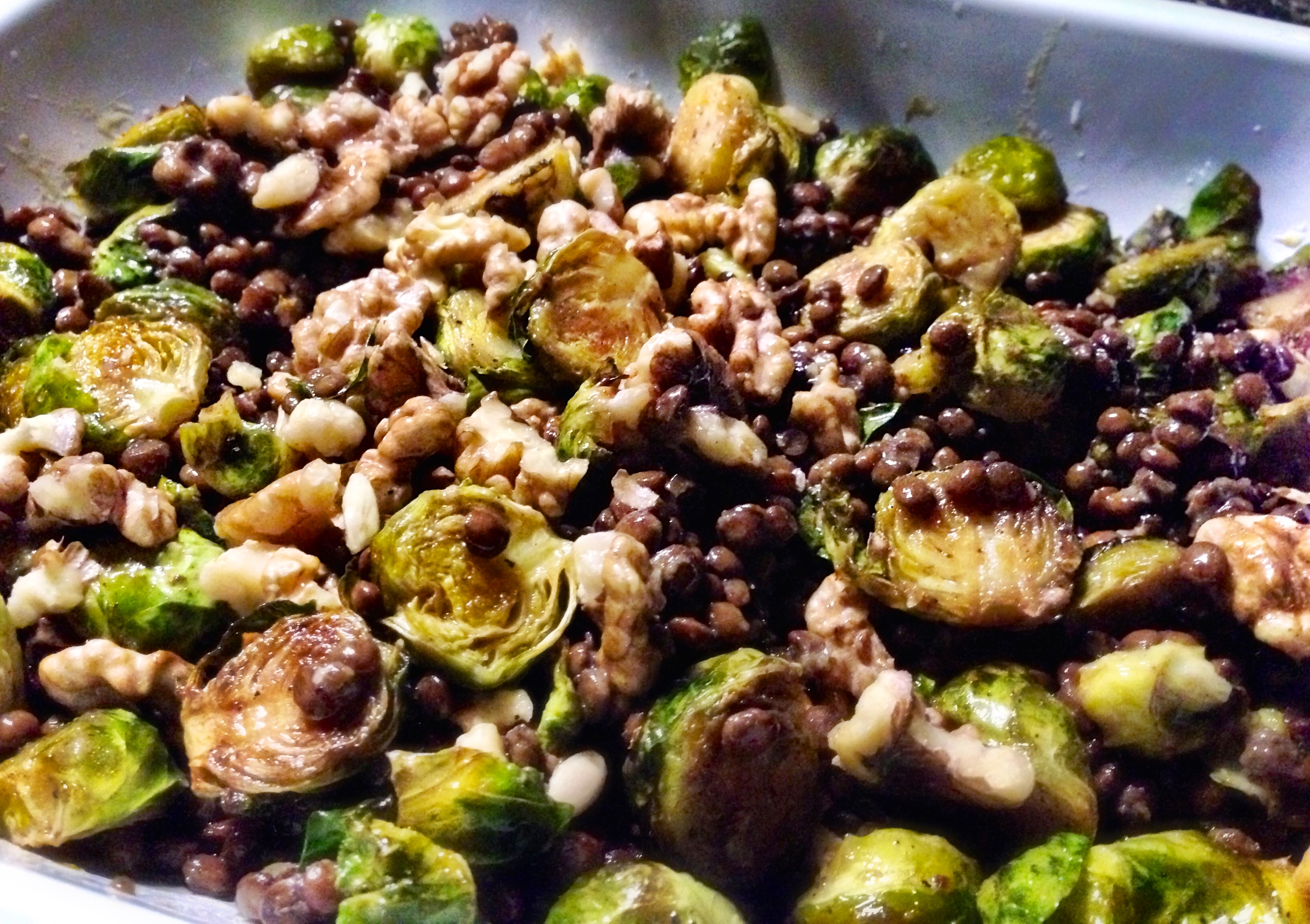 Then made a dressing (again very similar to the Broccoli dish) of oil, garlic, mustard, lemon juice (no egg yolk this time) an pour it over the lentils. Finally mix the lentil mix with the brussels and stir through some chopped walnuts.